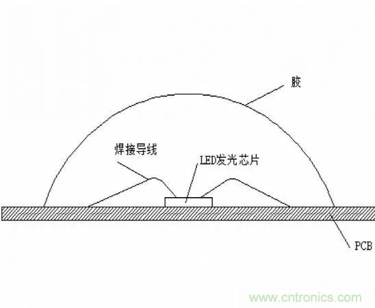 COB封裝,是英語Chip On Board的縮寫,直譯就是芯片放在板上。 是一種區別於DIP和SMD封裝技術的新型封裝方式。如圖所示