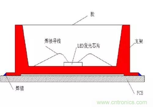 眾所周知,回流焊爐內一般會有240°的高溫。如果環氧樹脂膠TG點過低,或封裝過程有潮氣吸入,高溫會導致膠體非線性急劇膨脹,導致LED芯(xin)片(pian)焊(han)線(xian)拉(la)斷(duan)破(po)壞(huai)失(shi)效(xiao)。另(ling)外(wai)高(gao)溫(wen)會(hui)通(tong)過(guo)支(zhi)架(jia)管(guan)腳(jiao)將(jiang)熱(re)量(liang)快(kuai)速(su)傳(chuan)導(dao)到(dao)芯(xin)片(pian),造(zao)成(cheng)芯(xin)片(pian)體(ti)龜(gui)裂(lie)碎(sui)化(hua)失(shi)效(xiao)的(de)可(ke)能(neng)性(xing)增(zeng)加(jia)。而(er)這(zhe)種(zhong)問(wen)題(ti)是(shi)最(zui)可(ke)怕(pa)的(de),一(yi)般(ban)在(zai)工(gong)廠(chang)老(lao)化(hua)測(ce)試(shi)時(shi)也(ye)不(bu)會(hui)出(chu)現(xian)問(wen)題(ti),經(jing)過(guo)運(yun)輸(shu)到(dao)客(ke)戶(hu)端(duan)再(zai)使(shi)用(yong)一(yi)段(duan)時(shi)間(jian)問(wen)題(ti)就(jiu)會(hui)逐(zhu)步(bu)暴(bao)露(lu)出(chu)來(lai)。