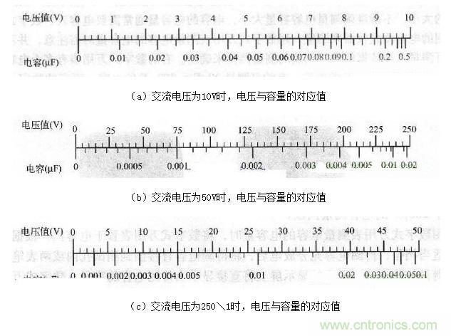 注意:(1)如果待測電容的電容量超出萬用表測量範圍,則不能用數字式萬用表測量。(2)數字式萬用表的表筆連接與指針式萬用表的表筆連接方法是相反的,指針式萬用表黑表筆接的是表內 電源正極,為表內電流流出端;數shu字zi式shi萬wan用yong表biao的de紅hong表biao筆bi接jie表biao內nei電dian源yuan正zheng極ji,為wei表biao內nei電dian流liu流liu出chu端duan。電dian容rong充chong分fen放fang電dian後hou將jiang萬wan用yong表biao紅hong表biao筆bi接jie電dian解jie電dian容rong正zheng極ji,黑hei表biao筆bi接jie電dian解jie電dian容rong負fu極ji可ke測ce出chu正zheng向xiang絕jue緣yuan電dian阻zu。反fan之zhi,萬wan用yong表biao紅hong表biao筆bi接jie電dian解jie電dian容rong負fu極ji,黑hei表biao筆bi接jie電dian解jie電dian容rong正zheng極ji可ke測ce出chu反fan向xiang絕jue緣yuan電dian阻zu。(3) 萬用表電壓法檢測電容用交流電壓法也可以檢測電容器,某些萬用表帶有此功能,如FM50型萬用表。下麵以FM50型萬用表為例,其檢測方法如下。萬用表的刻度盤上有交流電壓與電容容量相對應的刻度,如圖6所示。