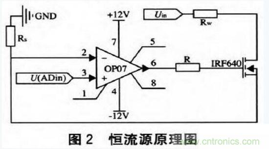 通過16位高精度模數轉換器ADSlll5輸出電壓給恒流源電壓轉換恒定電流電路,由於運算放大器OP07是精度高、低漂移運算放大器,並且在10歐負載的情況下輸出電流能達到2 A。所以采用OP07和IRF640組成的一個Uin。電流串聯負反饋來實現電壓到電流的轉換,具體電路如圖2所示。