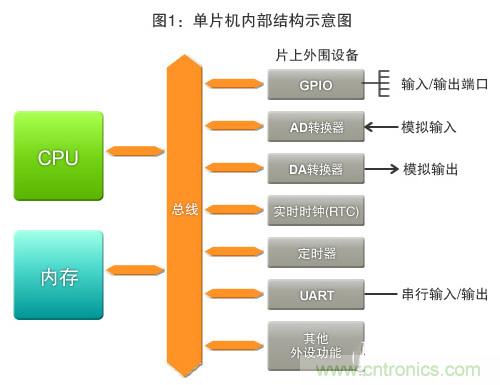 有效使用單片機不可或缺的“外設功能”是什麼呢?正如過去連載的“單片機入門”係列中所介紹的那樣,對電子產品進行控製的單片機是由CPU、內存及外設功能等部分組成的(圖1)。CPU根據指令(程序),執行運算、數據的讀寫以及進行條件判斷等,而內存則用來保存該程序(記憶)。