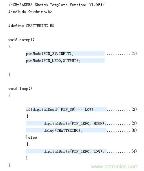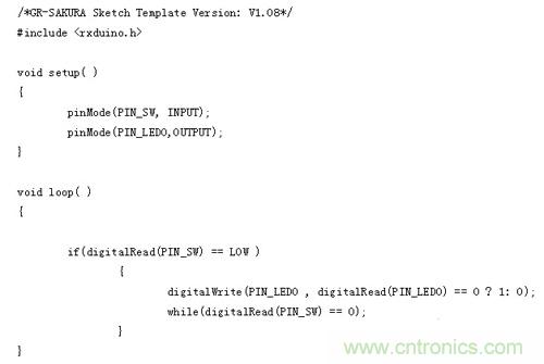 由於這次使用的是GR-SAKURA電路板上的開關和LED,所以即使不知道與其相連的引腳號和端口號,如為開關,隻需在程序中寫入“PIN_SW”,如為LED,隻需在程序中寫入“PIN_LED0”?“PIN_LED3”,櫻花程序庫(SAKURA Library)就會進行處理。
