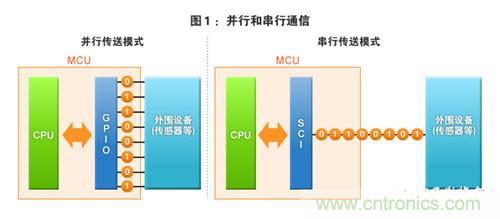 單片機是嵌入式設備的“頭腦”,其與作為嵌入式設備的“手和腳”是各種外圍設備(輸入輸出設備等)連接。單片機應該怎樣與這些外圍設備連接才好呢?比如,我們來考慮一下將傳感器與單片機連接的情況。如果使用本連載第1期中介紹的“GPIO”的話,從傳感器向單片機傳送8位信號時需要使用8個引腳。這種傳送模式被稱為並行(並行通信)模式(圖1―左)。但是,僅一個傳感器就需要連接8個引腳,確實太可惜了,是否還有連接更少的引腳就能達到同樣目的的方法呢?