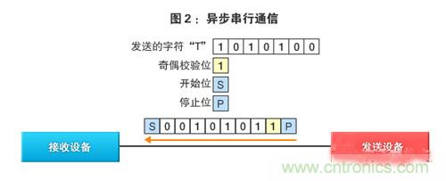 在異步通信模式的串行通信狀態下,一字節的文字信息※1在“開始位”(Start bit,意味著開始發送)和“停止位”(Stop bit,意味著停止發送)之間發送(圖2)。由此,無需I2C (Inter-Integrated Circuit,內部集成電路)”及“SPI(Serial Peripheral Interface,串行外設接口)”等時鍾信號線(但在其他的串行通信模式中這些時鍾信號線是必需的,以對發送和接收的時序進行同步)。另外,還可追加用於檢查數據是否已正常發送的“奇偶校驗位(Parity bit)※2”。