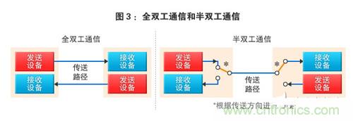 在異步通信中,能實現按“單片機→外圍設備”或“外圍設備→單片機”的方向確保數據信號專用的信號線時,被稱為全雙工通信。另一方麵,將通過1根信號線來切換通信方向的方式稱為半雙工通信。全雙工方式時需要2根信號線,可同時進行發送和接收。半雙工方式時僅需1根信號線,但必須在發送和接收之間進行切換(圖3)。