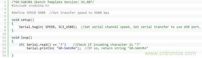 圖4:樣本程序:從Terminal輸入“?”後,將傳送回“GR-SAKURA”的信息。