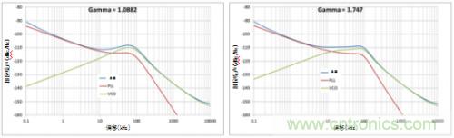 圖2所示為伽馬對相位噪聲的影響。回路帶寬和相位邊限相同,而伽馬值不同。伽馬值越高,由於噪聲整形回路濾波器平緩度提升,VCO的提升斜率也會變低。