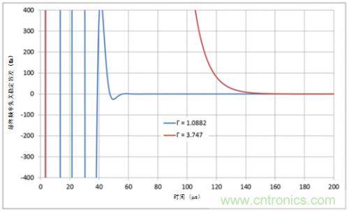 但較高的伽馬值也有其蔽處:鎖定時間更長。圖4所示為不同伽馬值下200MHz頻率躍變的鎖定時間;回路帶寬和相位邊限保持不變。當伽馬值和回路帶寬分別為1和3.7,穩定容差在±100Hz範圍內,模擬鎖定時間值分別為46.5µs與118µs。
