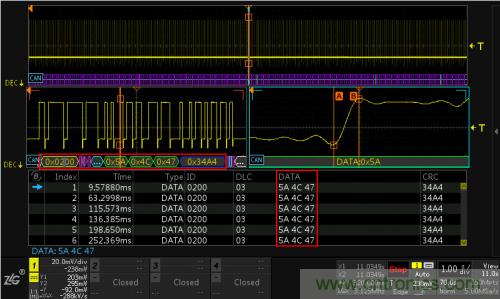 直接將波形數據解碼後以十六進製、十進製或字符的形式呈現出來,省去了工程師轉換的過程,大大加快了開發效率。如圖3為一段CAN協議的解碼,可以一步到位。