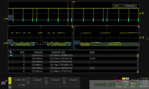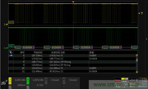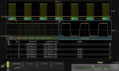 ZDS4000係列示波器免費標配以上30餘種協議解碼,支持解碼以“十進製”,“十六進製”,“字符”三種方式顯示,如圖9、10所示。