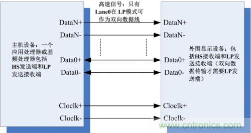 MIPI-DSI利用單端和差分信號線進行數據傳輸,LP模式下進行單端數據傳輸,HS模式下進行差分數據傳輸,使用可以雙向傳輸的Data0+/Data0-數據Lane進行配置。
