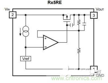 RX5RE的內部結構框圖如下圖所示,是經典的LDO電路模型。其中PMOS擁有極低的壓差,相比之下內部的靜態損耗能變得更小。