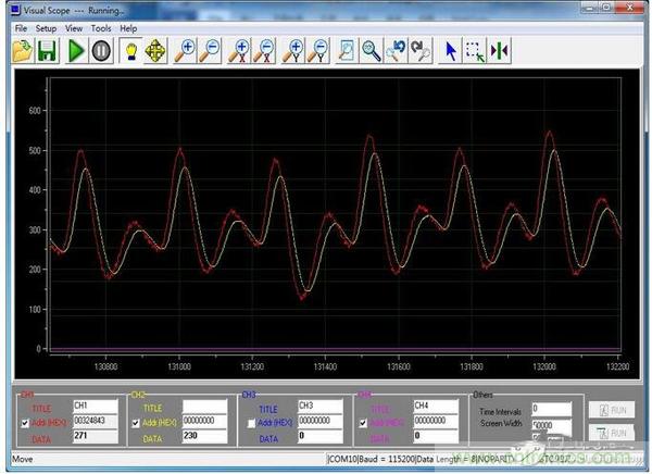 LDO本身的電壓輸出非常穩定,由於筆者ADC采樣為10位,在手指未放入傳感器時,電壓值幾乎保持在3/1024以內跳動。所以筆者默認這款LDO能達0.3%以下的精度。下圖便是筆者關於LDO給(gei)模(mo)擬(ni)部(bu)分(fen)供(gong)電(dian)後(hou)的(de)心(xin)率(lv)采(cai)樣(yang)波(bo)形(xing)。紅(hong)色(se)為(wei)一(yi)階(jie)低(di)通(tong)濾(lv)波(bo)前(qian)的(de)波(bo)形(xing),黃(huang)色(se)為(wei)低(di)通(tong)濾(lv)波(bo)後(hou)的(de)波(bo)形(xing)。對(dui)實(shi)時(shi)性(xing)要(yao)求(qiu)不(bu)高(gao)的(de)係(xi)統(tong)來(lai)說(shuo),這(zhe)樣(yang)的(de)模(mo)擬(ni)量(liang)波(bo)形(xing)已(yi)經(jing)能(neng)夠(gou)滿(man)足(zu)項(xiang)目(mu)的(de)需(xu)求(qiu)。