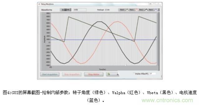 基於SmartFusion2 SoC FPGA的多軸電機控製解決方案通過USB連接至主機PC,並與圖形用戶界麵(GUI)通信,進行啟動/停止電機,設置電機速度值和其他係統參數,描繪多達四個係統變量,例如電機速度、電機電流和轉子角度(圖4)。