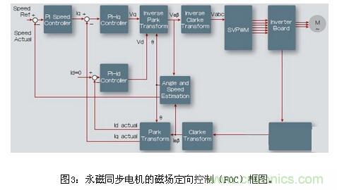 (1)電機控製IP模塊。圖3為無傳感器磁場定向控製算法,這一部分將會討論這些模塊,它們作為IP核提供。