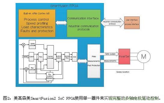 使用微控製器或DSP實現電機控製算法的方法並不容易擴展到多個以獨立速度運行的電機(多軸電機控製),美高森美SmartFusion2 SoC FPGA可以使用單一器件來實現集成且完整的多軸電機驅動控製(圖2)。