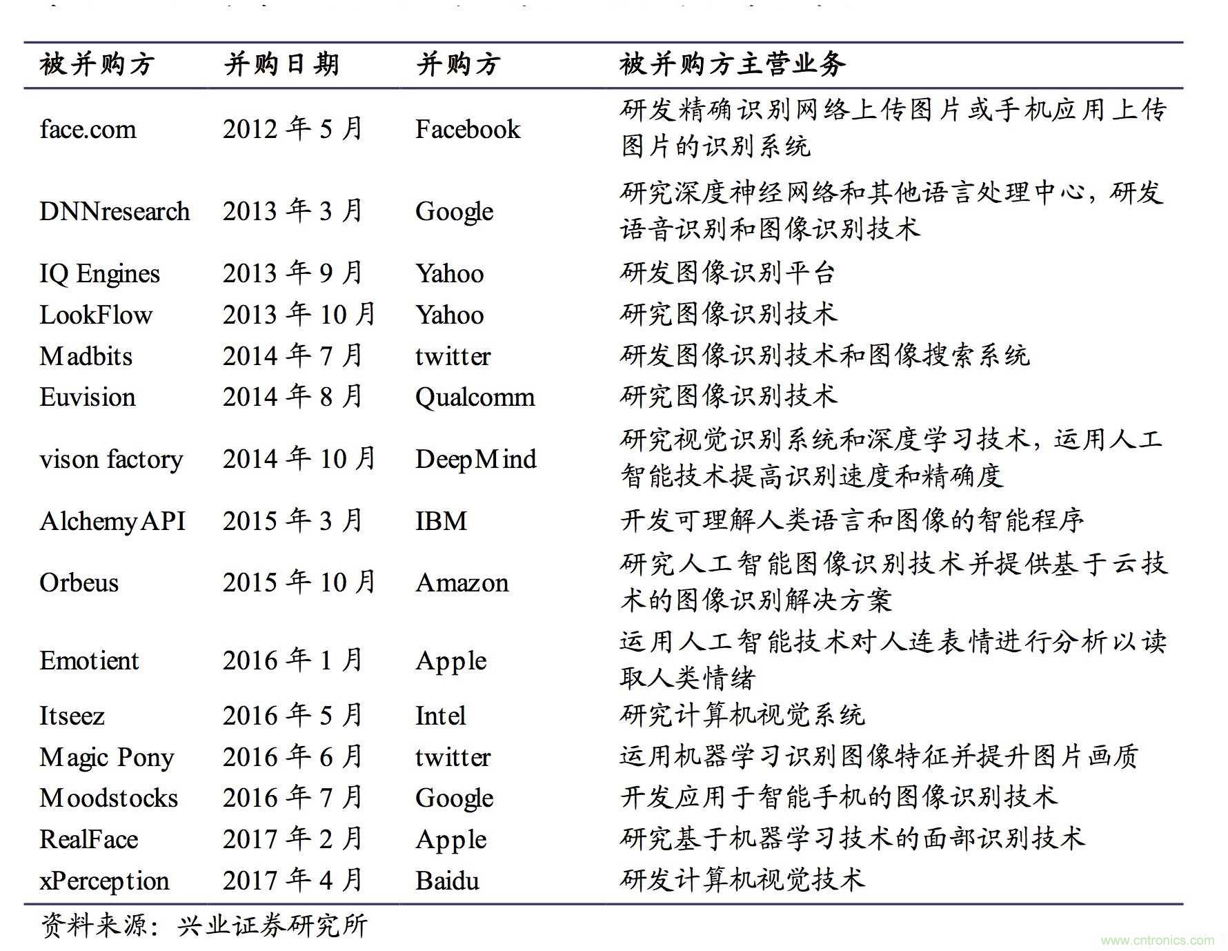 從終端廠商來看,蘋果、三星、華為、Facebook、穀gu歌ge的de多duo項xiang專zhuan利li顯xian示shi,各ge大da終zhong端duan巨ju頭tou都dou在zai紛fen紛fen布bu局ju人ren臉lian識shi別bie技ji術shu。各ge家jia科ke技ji巨ju頭tou主zhu要yao是shi采cai用yong自zi研yan為wei主zhu,並bing購gou為wei輔fu的de發fa展zhan戰zhan略lve。外wai延yan並bing購gou的de例li如ru蘋ping果guo、Facebook等。蘋果在人臉識別的應用專注於手機端,先後收購PolarRose,PrimeSense,Perceptio,Faceshift,Emotient,Turi等人臉識別相關技術公司;Facebook 2012年收購了以色列臉部識別公司Face.com。以下表格總結了國外巨頭公司 近幾年在人臉識別領域及其上下遊發生的外延並購。
