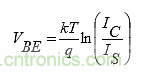 溫度感應設計通過巧妙的配置和計算來消除晶體管飽和電流(IS)的影響。使用恒流源(IC)以及晶體管和等同晶體管陣列之間的開關很容易控製飽和電流。在圖1中,我們看到VBE 和VBE(N)之間的差是如何輕鬆對應溫度變化的。 公式(1)顯示了晶體管基極-發射極電壓VBE的值。