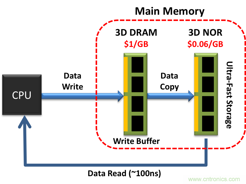 另一項建議是采用DDR4 NVDIMM,以取代DRAM作為主存儲器。非揮發性雙列直插式存儲器模塊(NVDIMM)有很多種類型;相較於其他以儲存為導向的NVDIMM,DDR4 NVDIMM能夠表現得和DRAM一樣快,而且可以作為主存儲器。幾年前,英特爾的3D XPoint看好DDR4 NVDIMM作為切入點,因為3D XPoint擁有NOR型閃存讀取延遲低(低於100ns)的優點,因而能像DRAM一樣快速運作。它也不需要預測軟件,因而能夠始終保持高性能。此外,采用單層儲存(SLC)的SLC NOR閃存具有很高的耐久性。因此,DDR4 NVDIMM的NOR閃存能夠取代DRAM,並以大量的主存儲器大幅提升係統性能,如圖3所示。