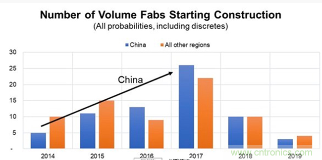 SEMI 預測,2018 和 2019 年全球晶圓廠設備支出將以三星居冠,但投資金額都不及 2017 年的高點。相較之下,為支持跨國與本土的晶圓廠計劃,2018 年中國大陸的晶圓廠設備支出較前一年將大幅增加 57%,2019 年更高達 60%。 中國大陸設備支出金額預計於 2019 年超越韓國,成為全球支出最高的地區。