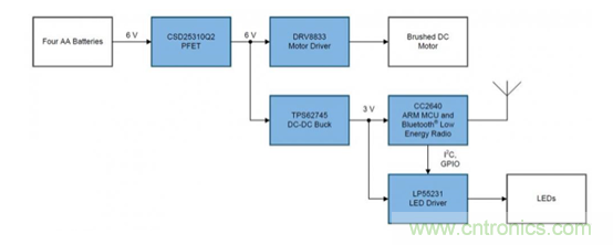 電機驅動器:驅動電流、電源電壓範圍、負載電機類型和安全關閉功能都是選擇電機驅動器時的因素。DRV8833可以驅動多種類型的電機和感性負載,峰值電流為2A,電源電壓範圍為2.7V至10.8V,非常適合使用四節AA電池。標稱驅動電壓電池的電壓是5V。