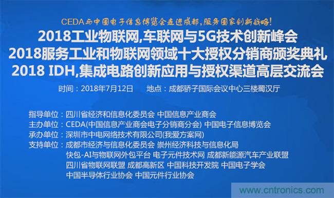 【導讀】中國芯片產業如何快速騰飛?CEDA認為,通過應用方案和授權渠道能快速占領市場。作為電子元器件的授權代理商協會組織,CEDA在中國信息產業商會的領導下服務國家創新和供應鏈戰略。7月12日(中國電子信息博覽會期間),CEDA將在成都世紀城驕子國際會議中心舉辦2018工業物聯網, 車聯網與5G技術創新峰會,嘉獎服務工業與物聯網領域的優秀電子元器件授權分銷商並舉辦IDH,芯片設計公司,元件公司和授權代理商高層的交流會。
