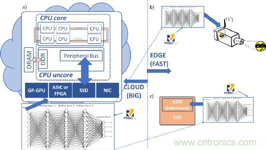 在圖1a中,雲數據中心服務器利用在大型大數據集上訓練的深度學習神經網絡來執行機器學習的功能。在圖1b中,邊緣設備中的安全攝像機采用經過大數據訓練的推理引擎來實時識別圖像(快速數據)。在圖1c中,智能固態硬盤設備采用推理引擎進行數據識別和分類,從而有效地利用了此設備的帶寬。圖1展示了RISC-V內核的潛在機會,它可以自由地添加專有的及未來標準化的矢量指令,這些指令對於處理深度學習和推理技術相當有效。