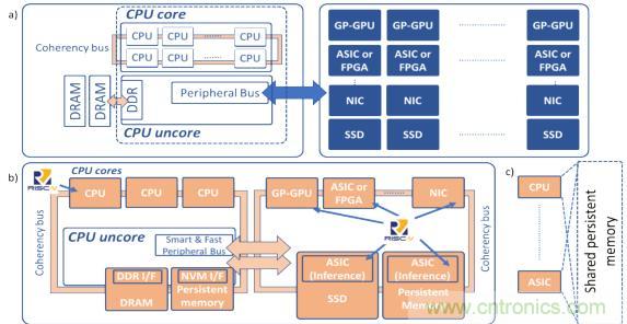 在圖2a中,傳統的計算體係結構由於把一條慢速外設總線用於快速存儲器及計算加速設備,其能力已達到其極限。在圖2b中zhong,未wei來lai的de計ji算suan體ti係xi結jie構gou采cai用yong了le開kai放fang接jie口kou,能neng夠gou為wei平ping台tai上shang所suo有you的de計ji算suan資zi源yuan提ti供gong統tong一yi並bing支zhi持chi高gao速su緩huan存cun一yi致zhi性xing的de訪fang問wen方fang式shi來lai訪fang問wen共gong享xiang持chi久jiu內nei存cun,(這稱為以數據為中心的體係結構)。在圖2c中,所部署的設備能夠使用相同的共享內存,從而減少了不必要的數據複製。