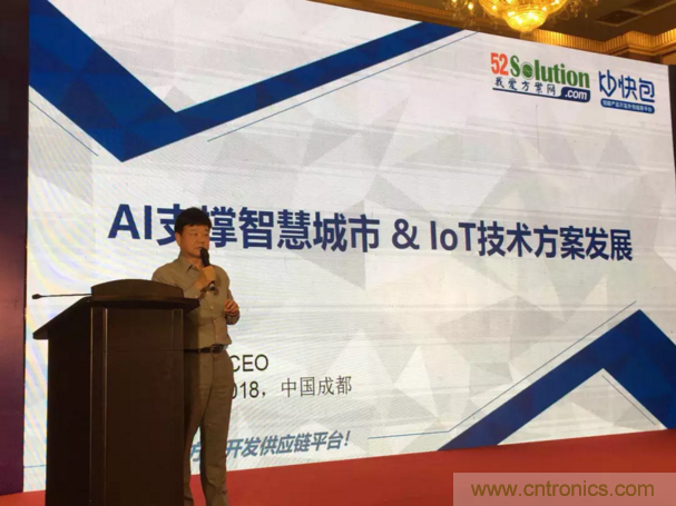 為服務西部產業創新,中電網絡技術/我愛方案網攜手四川本地技術服務商與中國電子信息博覽會來到成都,我愛方案網的CEO劉傑博士在2018中國智慧城市高峰論壇做大會報告,圍繞“AI支撐智慧城市和IoT技術方案發展”做了主題講演,分別介紹了AI發展路徑;通過大數據分析AI應用市場需求市場;解讀了AI處理器推動邊緣計算;列舉了大量AI物聯網方案開發案例,引起論壇參會人員的深度思考。