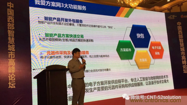 【導讀】為服務西部產業創新,中電網絡技術/我愛方案網攜手四川本地技術服務商與中國電子信息博覽會來到成都,我愛方案網的CEO劉傑博士在2018中國智慧城市高峰論壇做大會報告,圍繞“AI支撐智慧城市和IoT技術方案發展”做了主題講演。