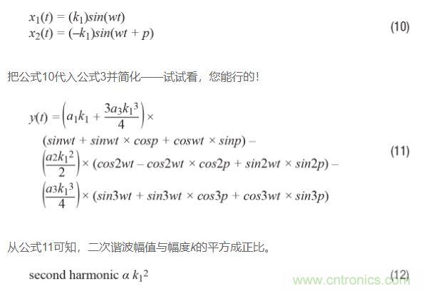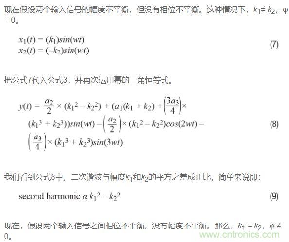 如果回過頭比較公式9和公式12,並且假設三角恒等式運用正確,那麼可以得出如下結論:二次諧波受相位不平衡影響比受幅度不平衡影響更嚴重。原因如下:對於相位不平衡,二次諧波與k1的平方成正比;再看公式12,對於幅度不平衡,二次諧波與k1和k2的平方差成正比,或看公式9。由於k1和k2大致相等,因此這種差異通常很小,特別是如果將其與平方數進行比較!