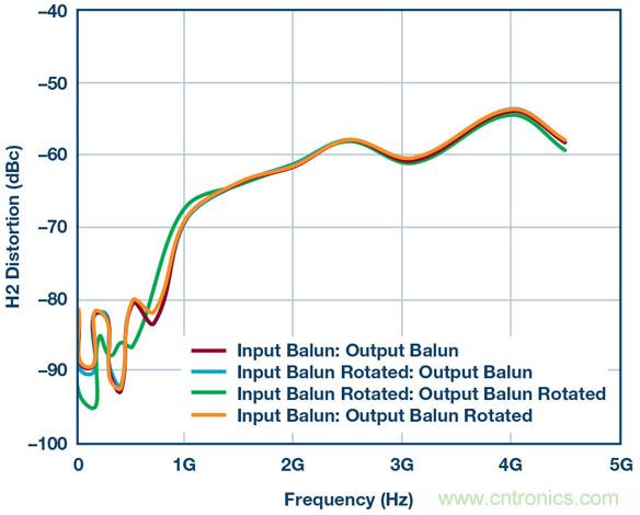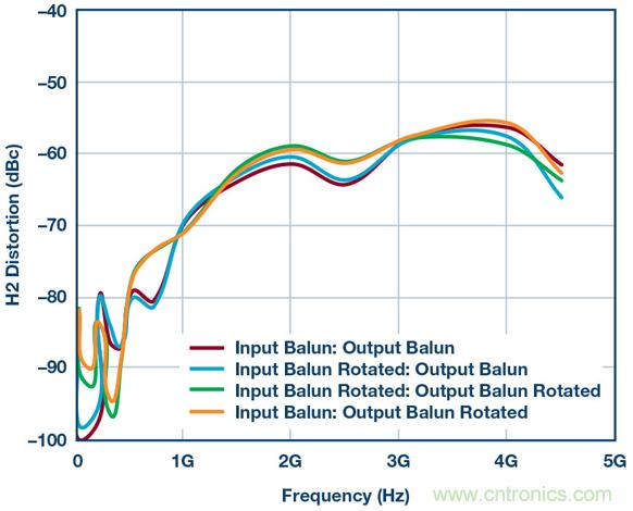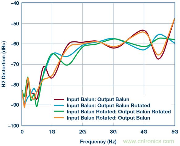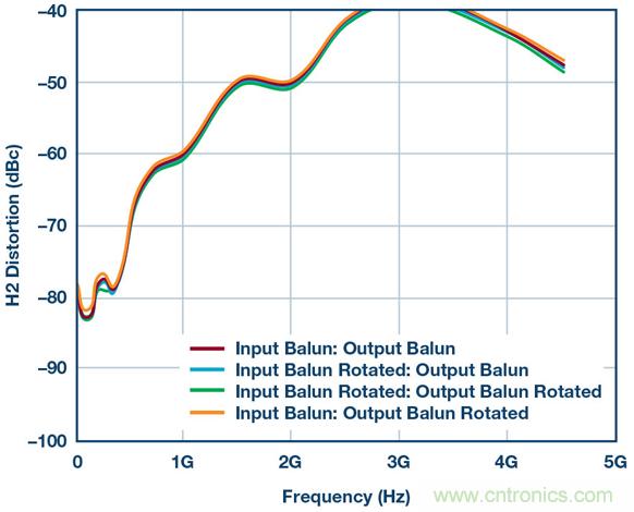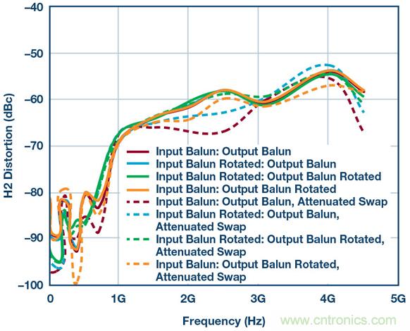 乍一看相當簡單,但魔鬼隱藏在細節中。圖3顯示了一組HD2測試結果,其係使用本框圖中的所有器件、差分放大器、巴倫、衰減器等得到的。這些測試證明:僅僅用不同方式翻轉巴倫方向所導致的細微相位不匹配,便能在HD2掃頻中產生不同結果。此設置中有兩個巴倫,因此通過顛倒設置一側或兩側的連接可以創建四種可能的場景。結果如圖3所示。