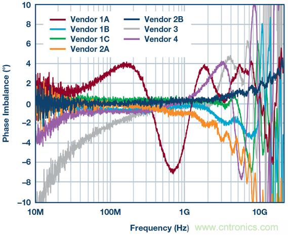 圖3揭示的HD2失(shi)真(zhen)曲(qu)線(xian)方(fang)差(cha)量(liang)證(zheng)明(ming),需(xu)要(yao)進(jin)一(yi)步(bu)考(kao)察(cha)巴(ba)倫(lun)的(de)性(xing)能(neng),特(te)別(bie)是(shi)相(xiang)位(wei)和(he)幅(fu)度(du)不(bu)平(ping)衡(heng)。以(yi)下(xia)兩(liang)幅(fu)圖(tu)顯(xian)示(shi)了(le)不(bu)同(tong)製(zhi)造(zao)商(shang)的(de)幾(ji)款(kuan)巴(ba)倫(lun)的(de)相(xiang)位(wei)和(he)幅(fu)度(du)不(bu)平(ping)衡(heng)。使(shi)用(yong)網(wang)絡(luo)分(fen)析(xi)儀(yi)來(lai)測(ce)量(liang)不(bu)平(ping)衡(heng)。