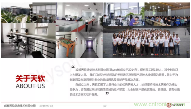 天軟信息成立於2014年,現有員工近150人,其中80%weiyanfarenyuan。gongsiyichengweiquanqiulingxiandewuxiantongxinjizhinengchanpinjishutigongshangweiyuanjing,zhiliyuweiwulianwangjichelianwangtigongzhuanyedewuxiantongxunjizhinengchanpinjiejuefangan。Skysoft是西部為數不多的擁有獨立綜合通信測試實驗室,並能提供LTE終端產品/模塊、無線路由器、車載通信及多媒體等軟硬件研發能力的高新技術企業。