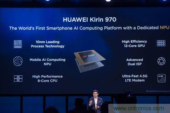 2017年9月,華為在德國柏林國際電子消費品展覽會(IFA)上正式推出其最新 AI 芯片 “麒麟 970”(Kirin 970)。麒麟 970集成 NPU 專用硬件處理單元(寒武紀IP),創新設計了 HiAI 移動計算架構,其 AI 性能密度大幅優於 CPU 和 GPU。10月,華為在德國慕尼黑發布了搭載麒麟 970的新款旗艦手機Mate 10,最主要的賣點便是人工智能。NPU新架構讓華為手機在處理同樣的AI任務時,得到了50倍能效和25倍性能提升。