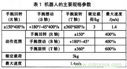 確定了空間結構和手腕結構後,可確定手腕回轉、手腕擺動及手腕旋轉三個姿態的自由度。其參數見表l (參數來於SSA2000工業機器人)。