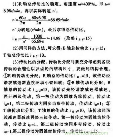 諧波齒輪減速器是一種新型的機械傳動變速機構。 與普通齒輪傳動相比,具有體積小,重量輕,結構簡單。它與傳動比相當的普通減速器比較,其零件減少50%。 體積和重量均減少l,3左右或更多。傳動比範圍大(單級傳動比為40~350,多級傳動比可達1600~100000),傳動效率高(單級傳動效率饑≥85%),傳動精度高。承載能力強等特點。 根據所選擇的電機,選擇型號為SGMAH—OIA,額定功率為loo W,額定轉矩為0.318 N·m,額定轉速為 3000 drain的交流伺服電動機。同時選擇XBl諧波減速機,機型為25,減速比為40,輸出力矩為1.0N·m,輸入轉速為3000 r/min。為了訂貨和維修方便,三軸均采用同一種減速器。
