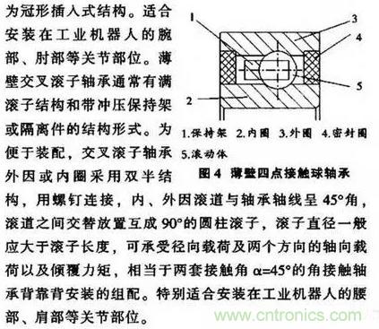 球qiu軸zhou承cheng是shi機ji器qi人ren和he機ji械xie手shou機ji構gou中zhong最zui常chang用yong的de軸zhou承cheng。它ta能neng承cheng受shou徑jing向xiang和he軸zhou向xiang載zai荷he,摩mo擦ca較jiao小xiao。其qi機ji器qi人ren專zhuan用yong軸zhou承cheng四si點dian接jie觸chu式shi設she計ji以yi及ji高gao精jing度du加jia工gong。這zhe種zhong軸zhou承cheng比bi同tong等deng軸zhou徑jing的de常chang規gui中zhong係xi列lie四si點dian接jie觸chu軸zhou承cheng輕qing25倍。它的內圈(或外圈)由兩個半圈精確拚配而成,而其整體外圍(或內圈) 的溝曲率半徑較小,使鋼球與內、外圈在四個“點”上shang接jie觸chu。既ji加jia大da了le徑jing向xiang負fu荷he能neng力li,又you能neng以yi緊jin湊cou的de尺chi寸cun承cheng受shou很hen的de兩liang個ge方fang向xiang的de軸zhou向xiang負fu荷he,並bing且qie有you很hen好hao的de兩liang個ge方fang向xiang的de軸zhou向xiang限xian位wei能neng力li,因yin為wei它ta的de軸zhou向xiang遊you隙xi相xiang對dui較jiao小xiao。而er其qi接jie觸chu角jiao (一般取為35)又較大。工業機器人專用薄壁四點接觸球軸承通常有帶密封圈和不帶密封圈的結構形式(見圖4)。其主要由內圈、外 圍、保持架、鋼球或非接觸式密封圈組成。內、外圈均為整體結構。鋼球與內、外因溝道呈四點接觸.保持架為冠形插入式結構。