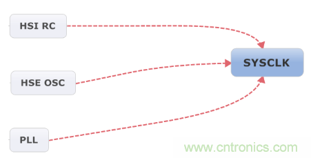1、 SYSCLK時鍾源有三個來源:HSI RC、HSE OSC、PLL