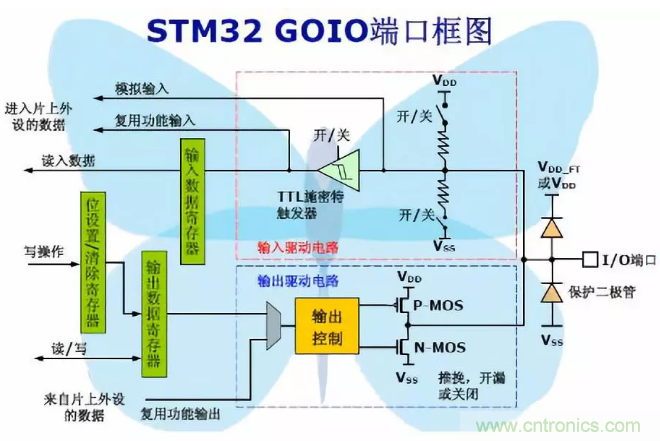 3、 GPIO口貌似有兩個反向串聯的二極管用作鉗位二極管。