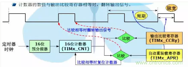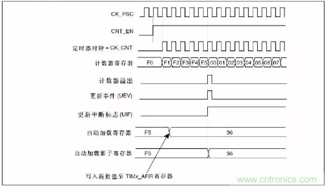 實際起作用的是影子寄存器,而程序員操縱的則是自動裝載寄存器。如果APPE位使能,表明自動裝載寄存器的值在下一次更新事件發生後才寫入新值。