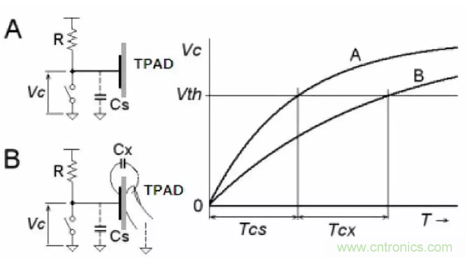 11、電容觸摸屏原理:通過充放電的曲線不同來檢測是否被按下。 實際的實驗過程中,TPAD可以用一塊覆銅區域來替代,通過電容的充放電常數來確定是否按下。