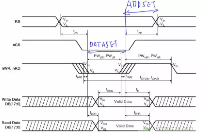 而ADDSET指的是地址建立時間,指的是片選之後到讀/寫操作之前的時間,這是針對SRAM來說的,如果操縱的是TFT,不存在地址線,所以此時的ADDSET就是讀/寫信號結束到RS電平的轉換時間。