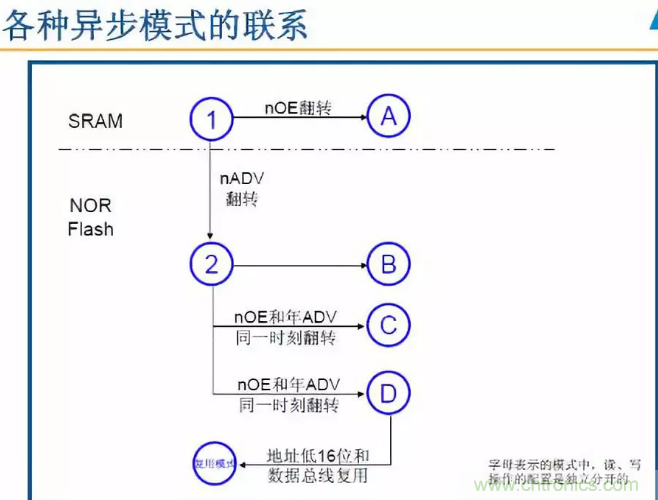 內核對外部存儲器的訪問信號發送到AHB總線後,經過FSMC轉換為符合外部存儲器通信規約的信號,送到外部存儲器的相應引腳,實現內核與外部存儲器之間的數據交互。