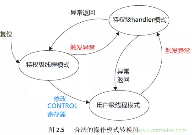 處理器也有兩種特權分級:特權級和用戶級。 這張圖說明了一切:複位進入特權級線程模式,如果有異常,進入特權級的handler模式處理異常或中斷例程,然後返回至特權級線程模式。通過修改CONTROL寄存器可以進入用戶級線程模式。