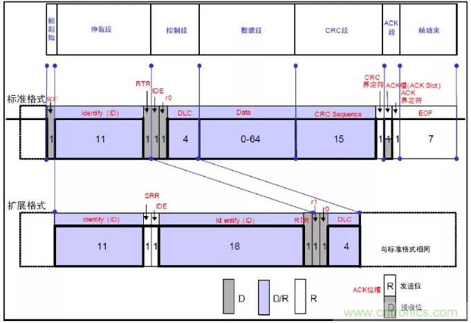 47、CAN協議的有5種類型的幀:數據幀、遙控幀、錯誤幀、過載幀、幀間隔。其中前兩種幀有標準格式(11位ID)和擴展格式(29位ID)。