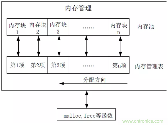 注意表中的分配方向,從頂到底。每一項對應一個內存塊。裏麵的數值代表了內存池的狀態:如果為0,表示該內存沒有被分配;如果非0,那麼數值的大小就表示了該塊內存被連續占用的內存數。