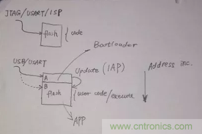 而在IAP編程中,flash被分區為A和B兩個區域,A區域隻允許用USB/USART等方式下載,此區域作為更新B區域的代碼用。