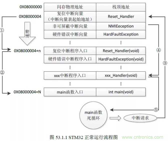 上圖表示STM32正常運行的流程圖,可以看到上電複位後係統從0x80000004處開始運行程序,這裏放置的是複位中斷向量,然後跳轉至複位中斷程序入口後再跳轉至main函數運行用戶的程序。
