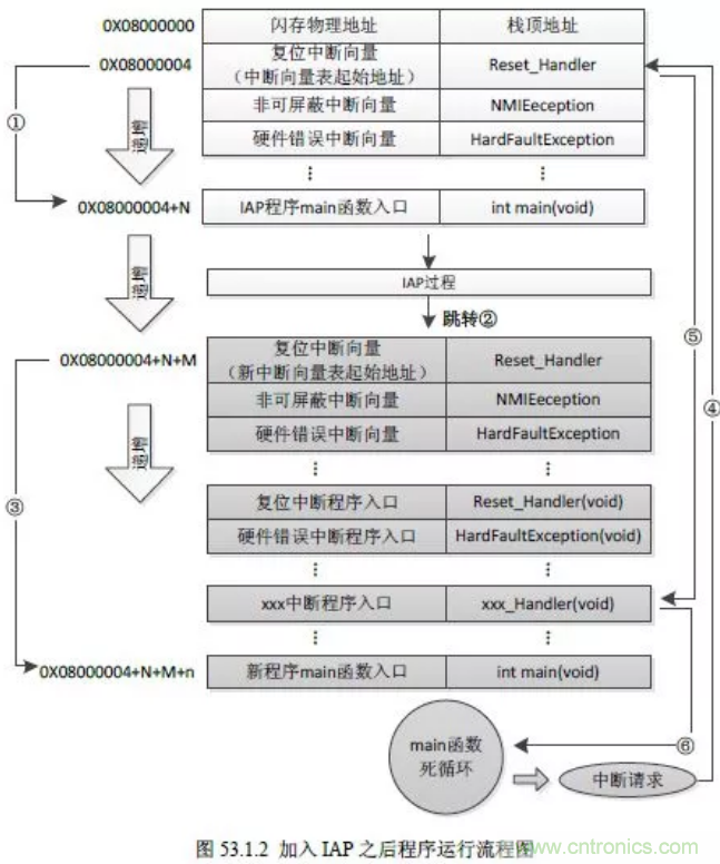 上圖表示加入IAP後的STM32程序運行流程圖。可以看到上電複位後跳到IAP程序的main函數處運行IAP過程(這個過程就是把下麵灰底色塊的程序代碼燒進B區域à代碼更新)。
